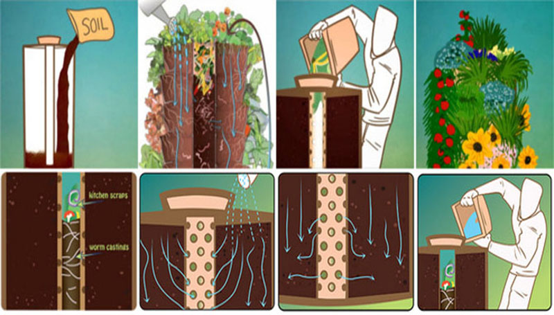 - Rác hữu cơ (rau củ quả bỏ, vỏ trái cây, cơm thừa, bã chè, cafe…) bỏ vào trụ vi sinh (giữa tháp), lượng rác này được ăn bởi trùn quế và đùn ra đất sẽ tạo ra một lượng phân bón hữu cơ cấp ngược lại cho cây. Trùn quế di chuyển khắp tháp rau và thải phân trùn quế, bổ sung dinh dưỡng và làm tơi xốp đất. Dịch trà trùn (chứa nhiều chất dinh dưỡng và vi sinh vật cố định đạm, lân, kali, ức chế nấm mốc phát triển…) chảy xuống khay chứa trà trùn dưới đế tháp, được tưới ngược lên đỉnh tháp, làm giàu dinh dưỡng cho rau phát triển tốt. KHÔNG PHẢI BÓN PHÂN, THAY ĐẤT.